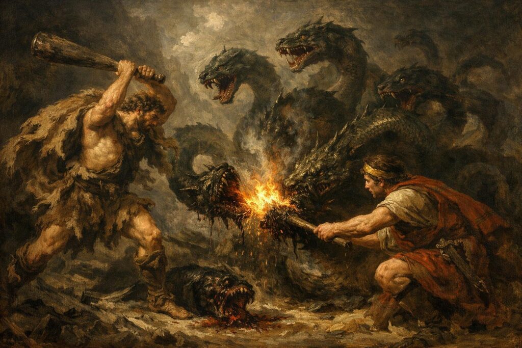 Percebendo que a força não bastava, Hércules contou com a ajuda de seu sobrinho, Iolau. A cada cabeça cortada, Iolau cauterizava o pescoço com fogo, impedindo que novas surgissem.