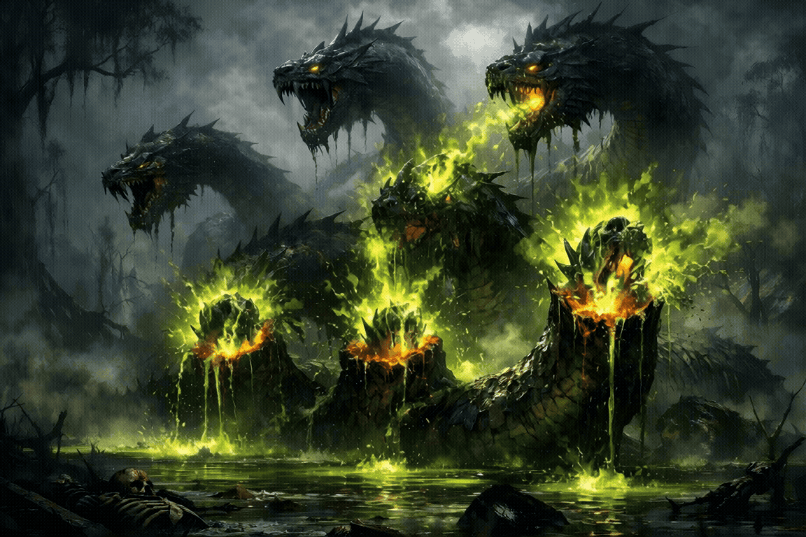 A Hidra habitava os pântanos de Lerna, uma região considerada amaldiçoada. Seu corpo lembrava o de uma serpente colossal, com várias cabeças, e cada uma delas escondia um terror maior: